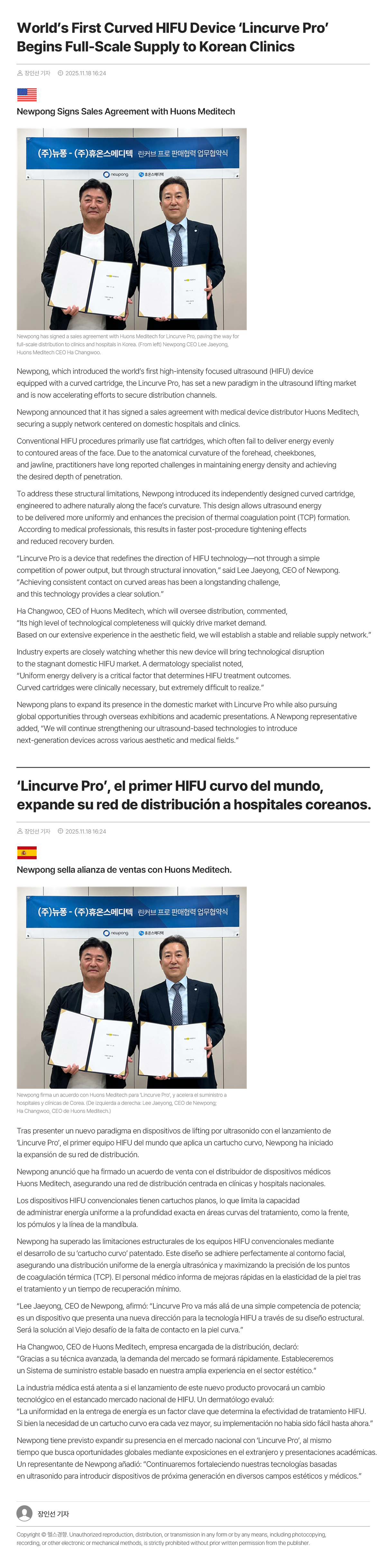 PREV Newpong Wins Outstanding Manufacturer Award at GMES 2025 ― Press Coverage NEXT “World’s First: Newpong Develops ‘Facial Curvature-Adaptive’ HIFU Medical Device, LINCURVE PRO ― Press Coverage by Health Kyunghyang